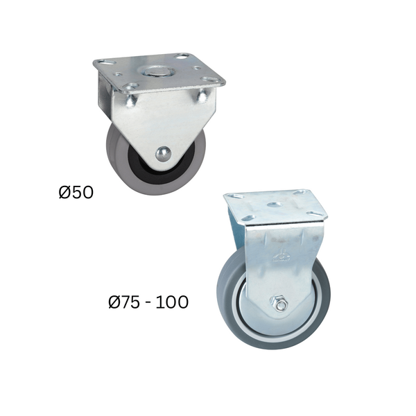 | Außen Ø / mm | Tragfähigkeit / kg | Bauhöhe / mm | Radbreite / mm | Plattengröße / mm | Lochabstand / mm | Loch Ø / mm | ||