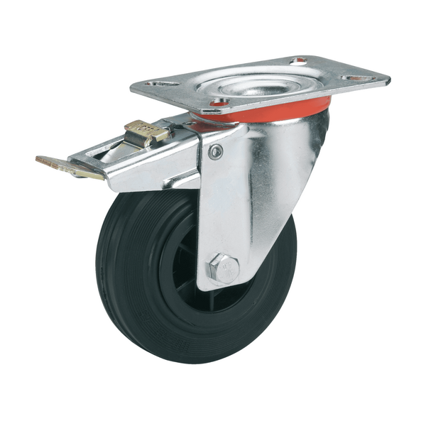 | Außen Ø / mm | Tragfähigkeit / kg | Bauhöhe / mm | Radbreite / mm | Plattengröße / mm | Lochabstand / mm | Loch Ø / mm | ||